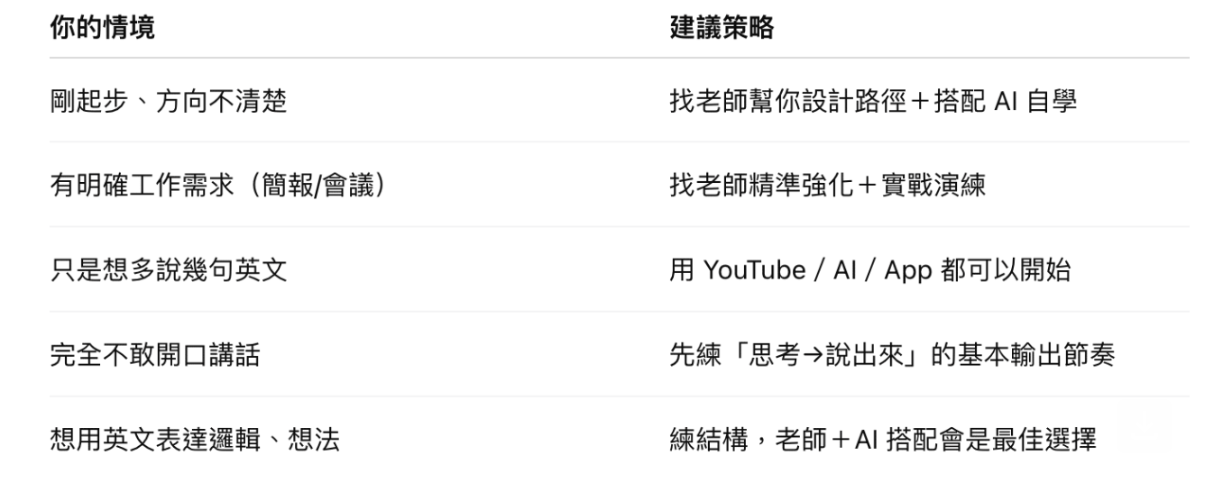 高階(C1–C2):「老師+語言夥伴+AI 補量」